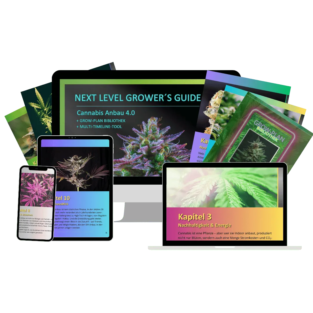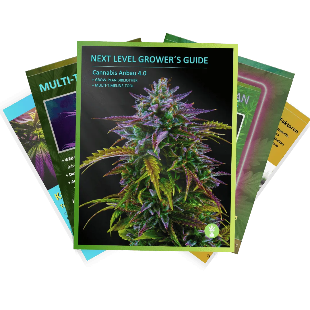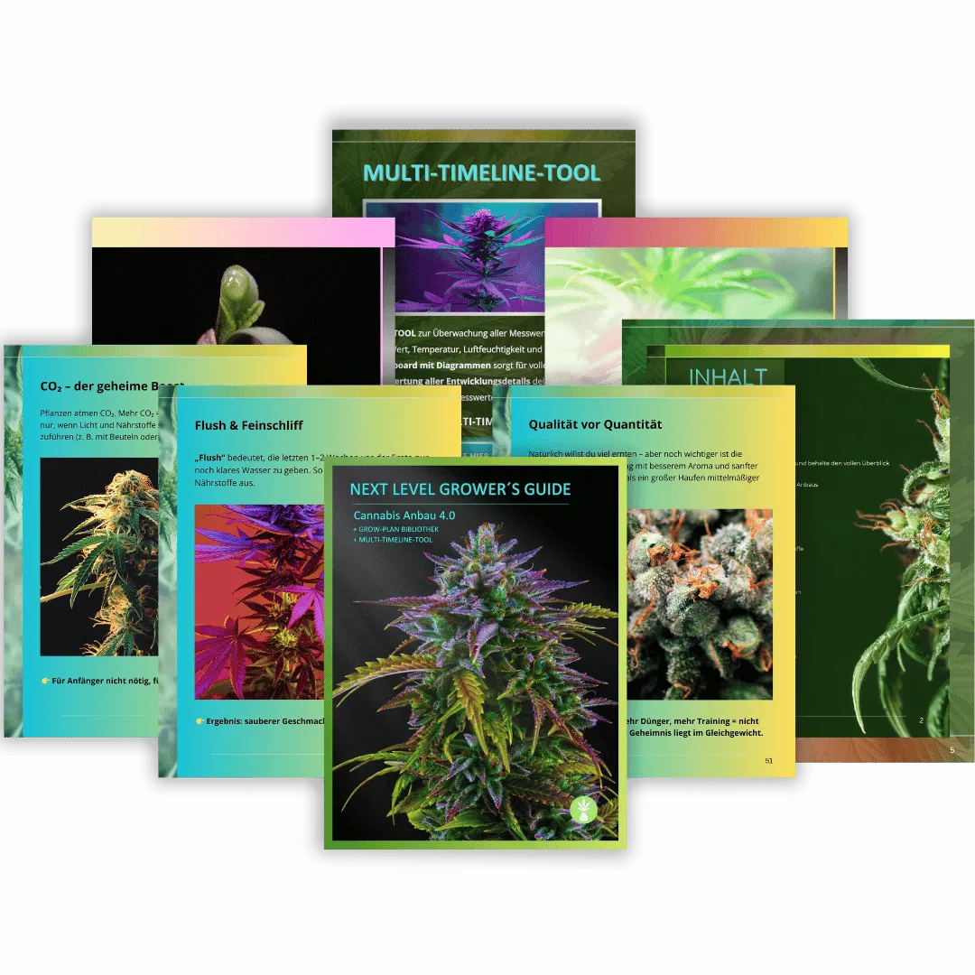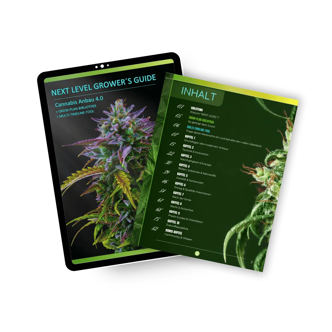 In diesem Guide findest du digitale Grow-Pläne, Checklisten und unser Multi-Timeline-Tool zur vollen Kontrolle deiner Licht-, Temperatur-, Luftfeuchtigkeits-, EC- und ph-Werte. „Next Level“ bedeutet - einen Schritt weiterzugehen: